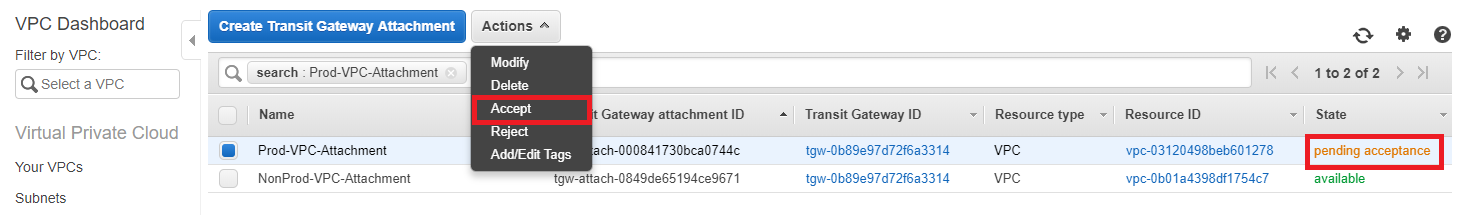 If you selected the option to “auto accept shared attachments” when we created the Transit Gateway, the attachments are done. If you didn’t select that, then you need to go back to the account where you deployed the TGW and accept the attachment from the “Transit Gateway Attachment” menu. You can see below that the attachment isn’t valid until it’s been accepted from this account.