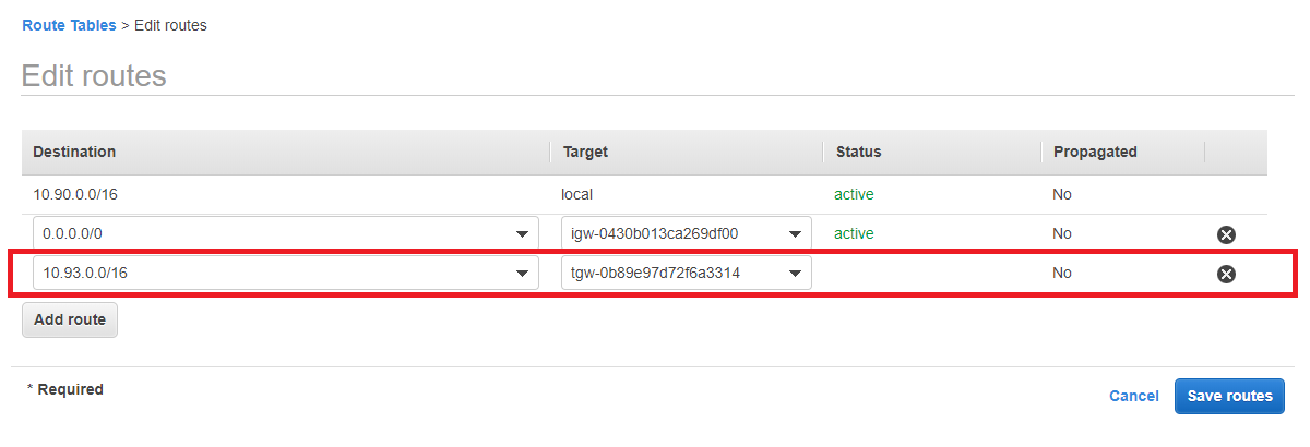 Now, I’ll add a route for my on-premises infrastructure so that my VPC workloads can access my data center through the Transit Gateway VPN connection.