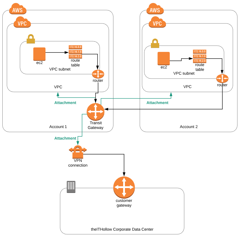 Before we talk about the setup steps, lets take a look at what we’ll be building. The diagram below shows the overall configuration. At the bottom of the diagram we have my on-premises home lab which will be inter-connected to the AWS cloud through a VPN connection terminating a on the Transit Gateway. The Transit Gateway will live within Account 1 and will need to be attached not only to a VPN tunnel, but also to a VPC within the same account and another VPC in a second (spoke) account. The rest of the setup depends on route tables to ensure that EC2 instances will direct traffic destined between VPCs or Data Centers through this transit gateway service.