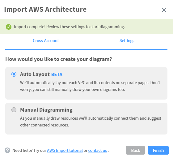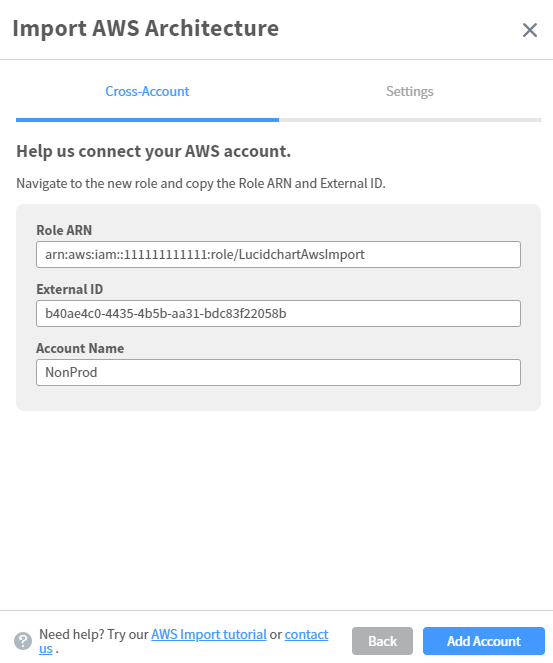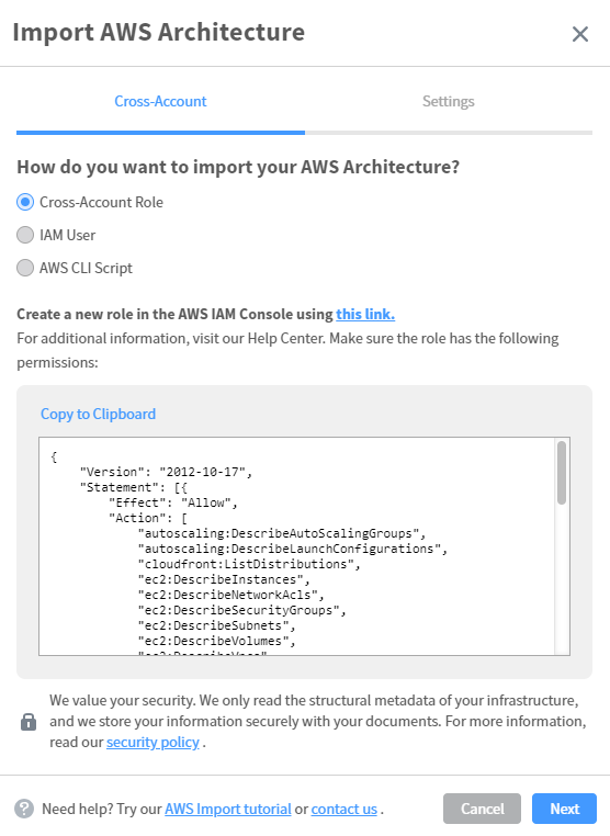 Next, you’ll need to give Lucidchart permissions to read data from your AWS account. As you can see there are several ways to accomplish this including the preferred method of using a Cross-Account Role. This screen will show you the permissions needed and generate the policy code to deploy these permissions in your AWS account. At this point you should go setup this Cross-Account Role in your AWS environment based on the instructions from Lucidchart.