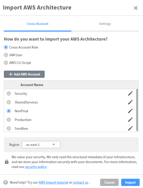 You can perform this Cross-Account role task several times so that you can add multiple accounts to your LucidChart portal. You only need to complete this one time (per account) and the credentials can be reused. This is particularly handy if you want to periodically refresh your network diagrams. You can see frommy screenshot below that I’ve added five AWS accounts to my Lucidchart portal. Now, when you’re ready to build a diagram, select the account you want to connect to and then the region from the drop down.