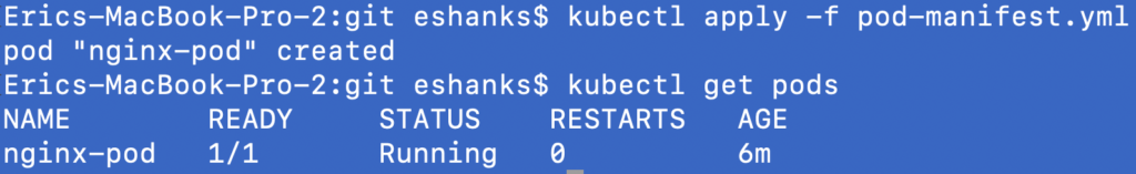 Before we dive too far into this, you should know that this section shows some basics about deploying your first pods in a Kubernetes cluster, but these are considered “naked pods” and should be avoided in production. This section is to get you comfortable first. In a later post we’ll discuss how to use pods with ReplicaSets or Deployments to make your pods more highly available and more useful.