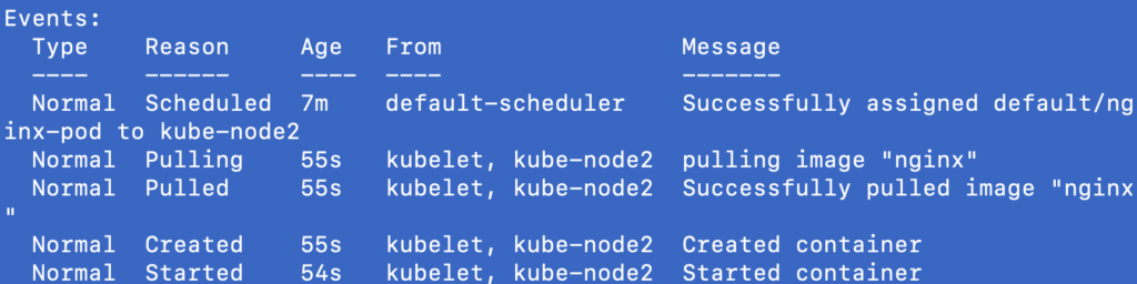 The screenshot below omits a lot of the data (because it was difficult to fit on this page mainly) but it does show the events for the pod listed at the bottom. When you run this on your own you should see a wealth of knowledge about the pod.