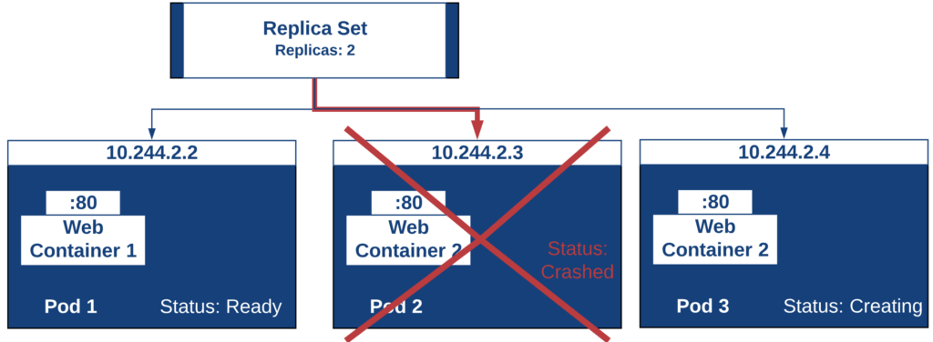 If one of the pods thats is part of a replica set crashes, one will be created to take its place.