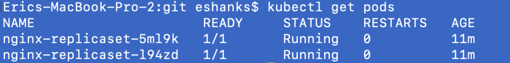 As you can see from my screenshot, we now have two pods running as we were expecting. Note: if you run the command too quickly, the pods might still be in a creating state. If this happens wait a second and run the get pod command again.
