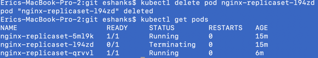 As you can see from my screenshot, I deleted a pod and then immediately ran another get pods command. You can see that one of my pods is in a Terminating status, but there is a new pod that is now running and thats because our Replica Set specified that two pods should be available. It is ensuring that we have that many at all times, even if one fails.