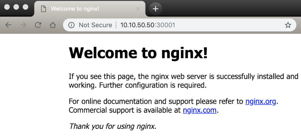 Here’s the real test, can we open a web browser and put in an IP Address of one of our Kubernetes nodes on port 30001 and get an nginx page?