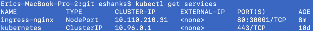 Neat! Now we have a Service named ingress-nginx which we defined in our manifest file. We also have a Kubernetes Service which, for now, we’ll ignore. Just know this is used to run the cluster. But do take a second to notice the ports column. Our ingress-ngnix service shows 80:30001/TCP. This will be discussed further in a future post, but the important thing is that the port after the colon “:” is the port we’ll access the service on from our computer.