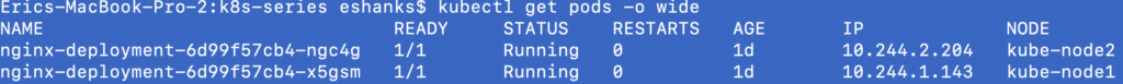 Now those endpoints should be the IP addresses of our pods that we deployed in our manifest. To test this, lets use the get pods command with the -o wide switch to show more output.