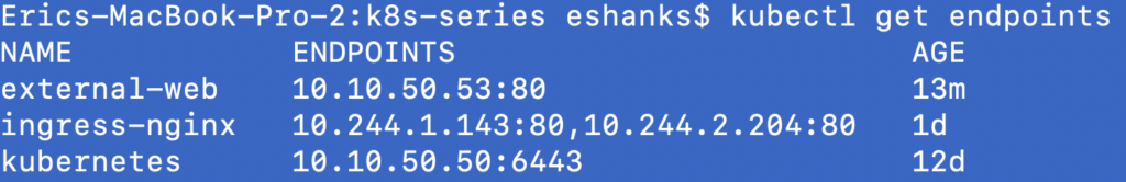 The ingress-nginx endpoint is the one we’re focusing on and you can see it has two endpoints listed, both on port 80.