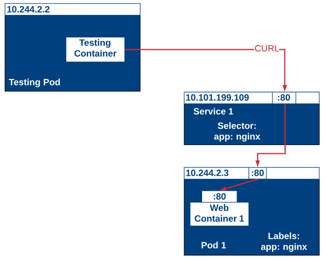 As we mentioned, we can’t access our containers from outside our cluster by using just a ClusterIP so we’ll deploy a test container within the Kubernetes cluster and run a curl command against our nginx service. The picture below describes the process we’ll be testing.