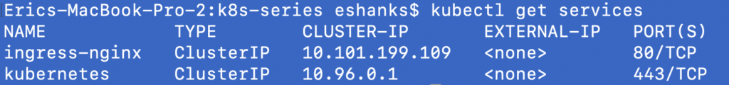 We can see that the ClusterIP for our ingress-nginx service is 10.101.199.109. So next, we’re going to deploy another container just to run a curl command from within the cluster. To do this we’ll run some imperative commands instead of the declarative manifest files.