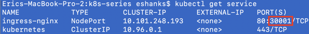 Once it’s deployed we can look at the services again. You’ll notice this is the same command as we ran earlier but this time there are two ports listed. The second port is whats mapped to our NodePort.