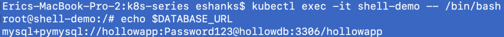 Once we have a shell session, we can do an echo on our DATABASE_URL environment variable and it should show the string from our ConfigMap.