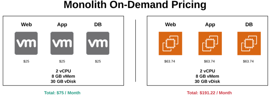 So the on-premises VMs came out to about $25 per month for a 2 vCPU / 8 GB vMem / 30 GB vDisk on a popular hyper-converged solution. We then used the AWS pricing calculator to determine what those same sized VMs would cost on AWS with the standard on-demand hourly pricing. You can see that the public cloud is in fact more expensive if you run your infrastructure this way.