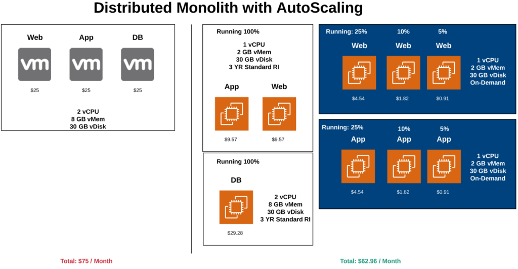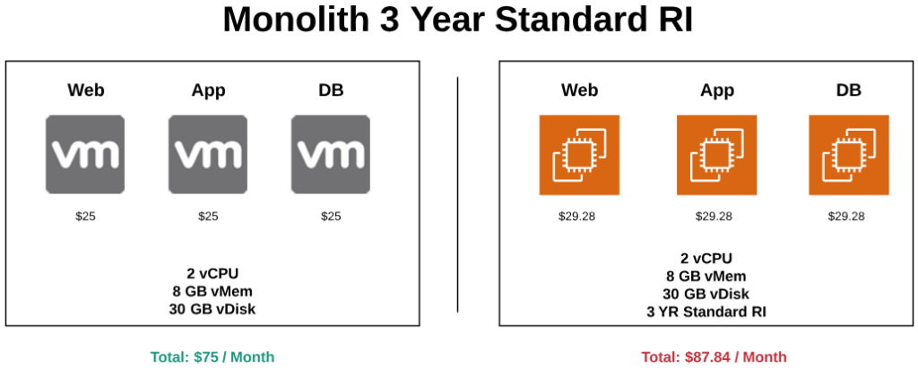 The simplest way to decrease your costs is to add a Reserved Instance (RI). An AWS RI is a way for you to commit to running this instance long term and you can get a discount. These RIs come in 1 year or 3 year terms and since the calculations for the on-premises VMs used a three year depreciation schedule, I’ve used a three year RI to see what happens to the price. Note that no architectural changes were made to the app at this point.