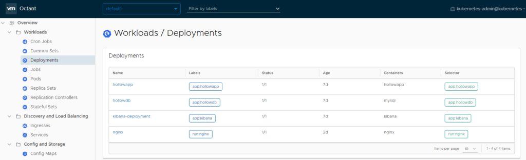 On the left hand side of the dashboard you’ll have a list of objects to view. Selecting one of those will show a table with the objects and some details about them. For example, you can see the “Selector” configured for a particular deployment in my example below.