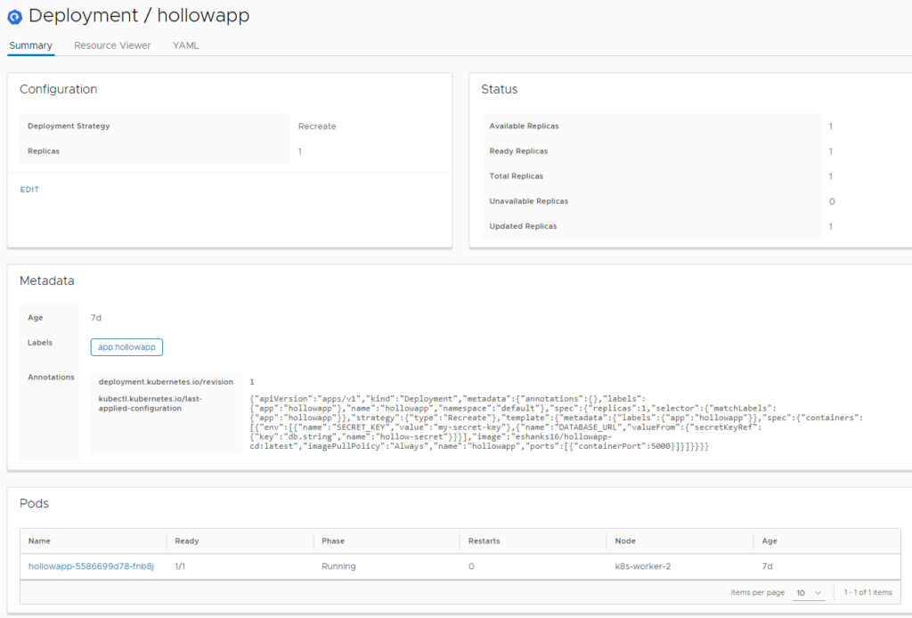 Once you find an interesting object to look into further, simply click the object for find more details. For instance I can see my metadata about my pods, and their status.