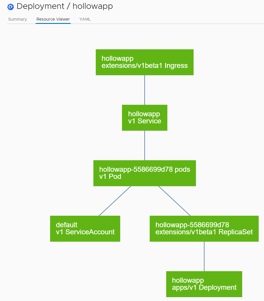 OK, right now it still kind of looks like a web GUI to show us code again, but take a look at the resource viewer tab. Here, we can see just how our pods, services, ingress rules, replica sets and deployments are all hooked together. What a great way to quickly view resources in your cluster.