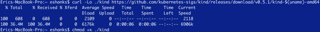 Once we’ve got Docker up and running, it’s time to download the Kind binary to our laptop and then put that binary into our system path. We can do this by opening up a terminal on our laptop and pulling down the binary using curl, and then changing the permissions so we can execute the binary.