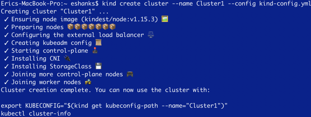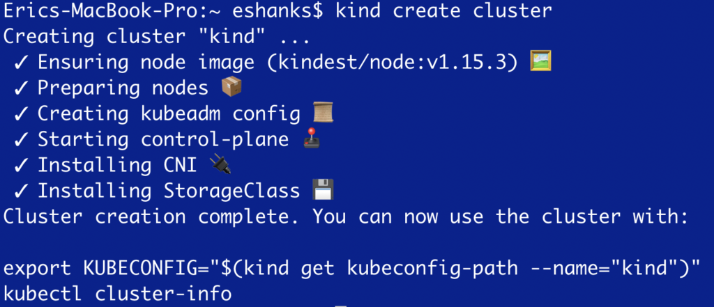 After running this command, a new Kubernetes cluster will be stood up on your laptop using docker containers. You’ll notice that at the end of the create cluster routine, it lists the command needed to get the kubeconfig file and export it so that it can be used with the kubectl binary and start interacting with the cluster. In my case it was: