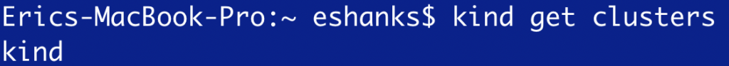 This command will show you the list of all kind clusters on your system. You’ll notice by default that the name of your cluster is also “kind”. If you’d like to create a cluster with a specific name, you can use the command: