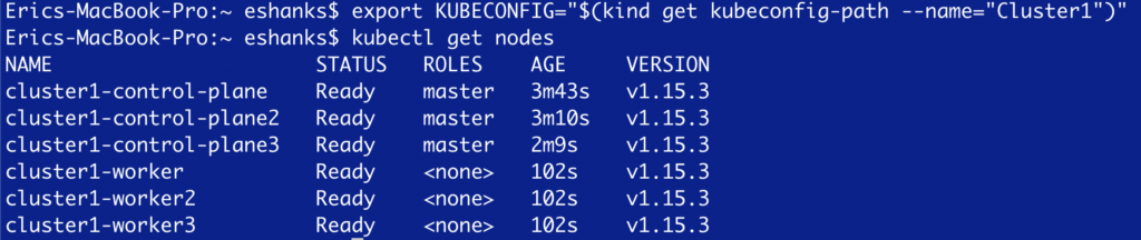 Once the cluster is built, and you’ve exported your KUBECONFIG again, you’ll see that the cluster matches the configs.