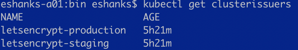 Let’s see it in action in my AWS cluster using the LetsEncrypt. We’ll deploy cert-manager and issue a staging cert which is a temporary cert to make sure things are working properly, and then later a production certificate which is fully trusted by most browsers.