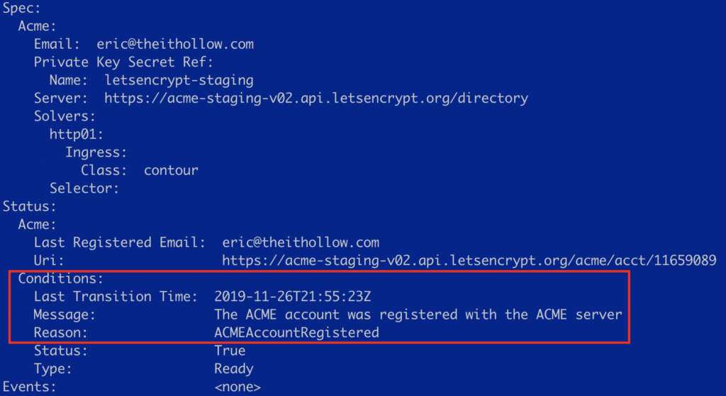 If you want to go one level deeper, run a kubectl describe on the ClusterIssuers. You should see that the account was registered correctly.