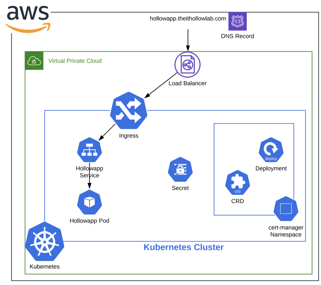 secretName: hollowapp-tls-stage - a secret name meaningful to you. This is where your app will store the certificate returned by cert-manager.