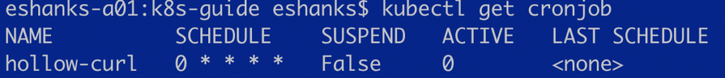 Once deployed, we can check to see if we can list the CronJob by running a “get” on the cronjob object.