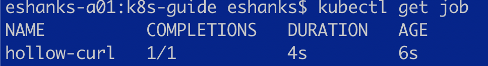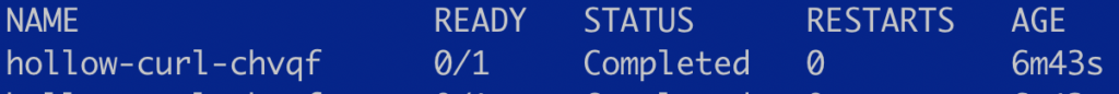 According to the events, we can see that our job completed successfully already. Next, lets just check if there are any pods deployed. Sure enough, a pod was deployed and it has a status of completed.