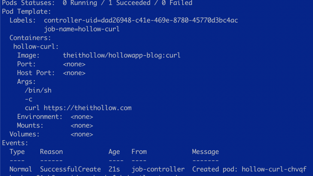 First, we’ll deploy a simple job that will run curl against this blog just to see if it will work. I’ve created a simple alpine container with the curl installed on it. We’ll use this container image to run curl against this site. The manifest below will create our simple curl job.