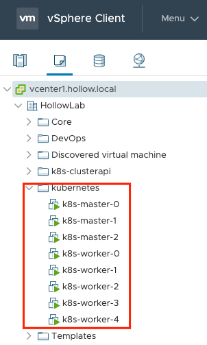 These Kubernetes virtual machines should be placed within their own VM folder in vSphere. You can see that I created a folder named “kubernetes” for this post.