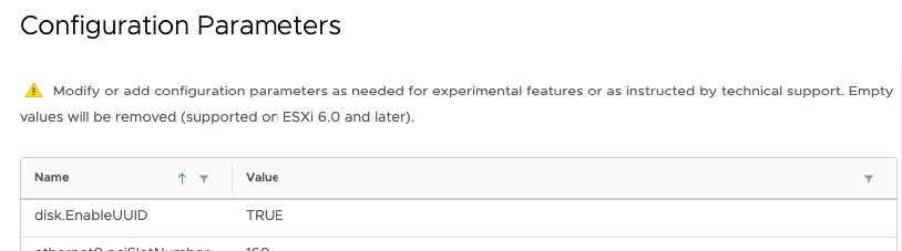 Also, the virtual machines that will be used for the Kubernetes cluster need to have an advanced setting changed for each VM. The disk.EnableUUID parameter must be set to true. This can be automated of course, but this post focuses on the manual settings so you can see whats happening.