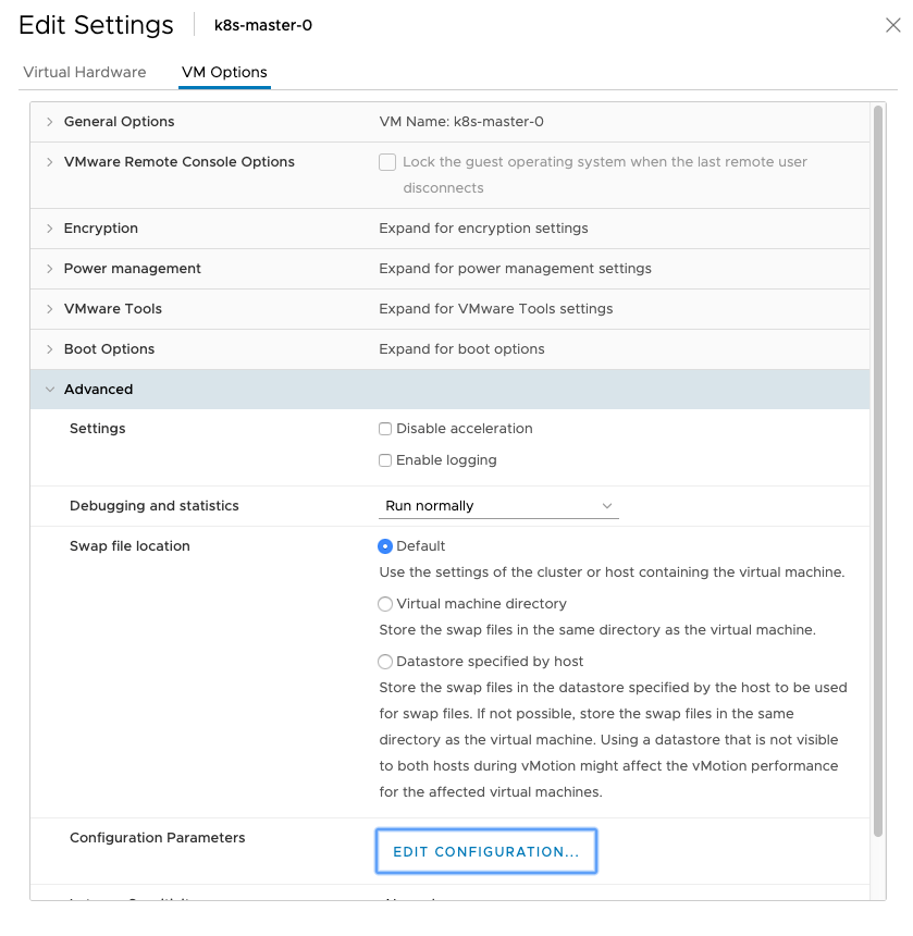 Right Click the k8s node in vCenter and choose edit settings. From there, go to the VM Options tab and scroll down to find the “Edit Configuration” link in the Configuration Parameters settings.