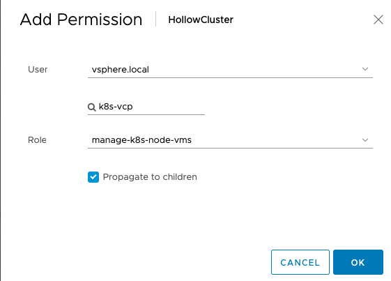 For example, in my vSphere Cluster where my k8s vms live, I’ve added the " manage-k8s-node-vms" role to my k8s-vcp user and set it to propagate. Do this for each permission in the list above.