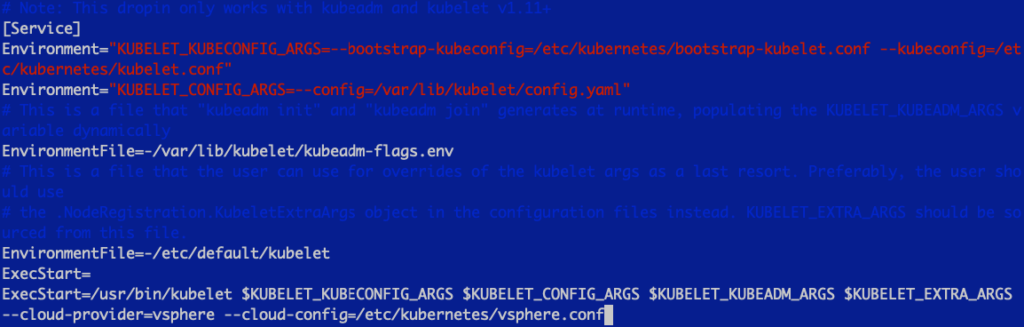Once you’ve placed the Kubeadm.conf and vsphere.conf files in the /etc/kubernetes directory, we need to update the configuration of the Kubelet service so that it knows about the vsphere environment as well.