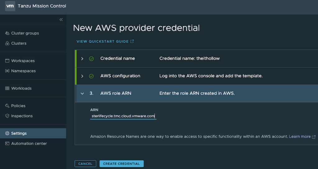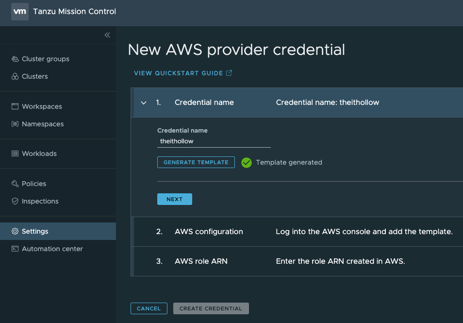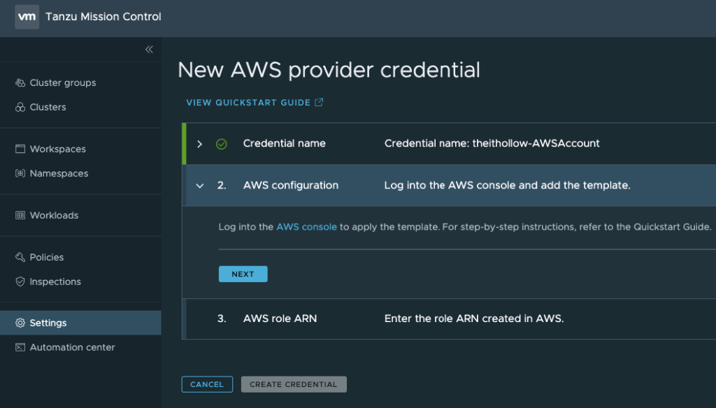 For this example, I’ll create a new Kubernetes cluster within my AWS account. Before we setup the cluster, we need to configure access to our AWS Account so that TMC can manage resources for us.