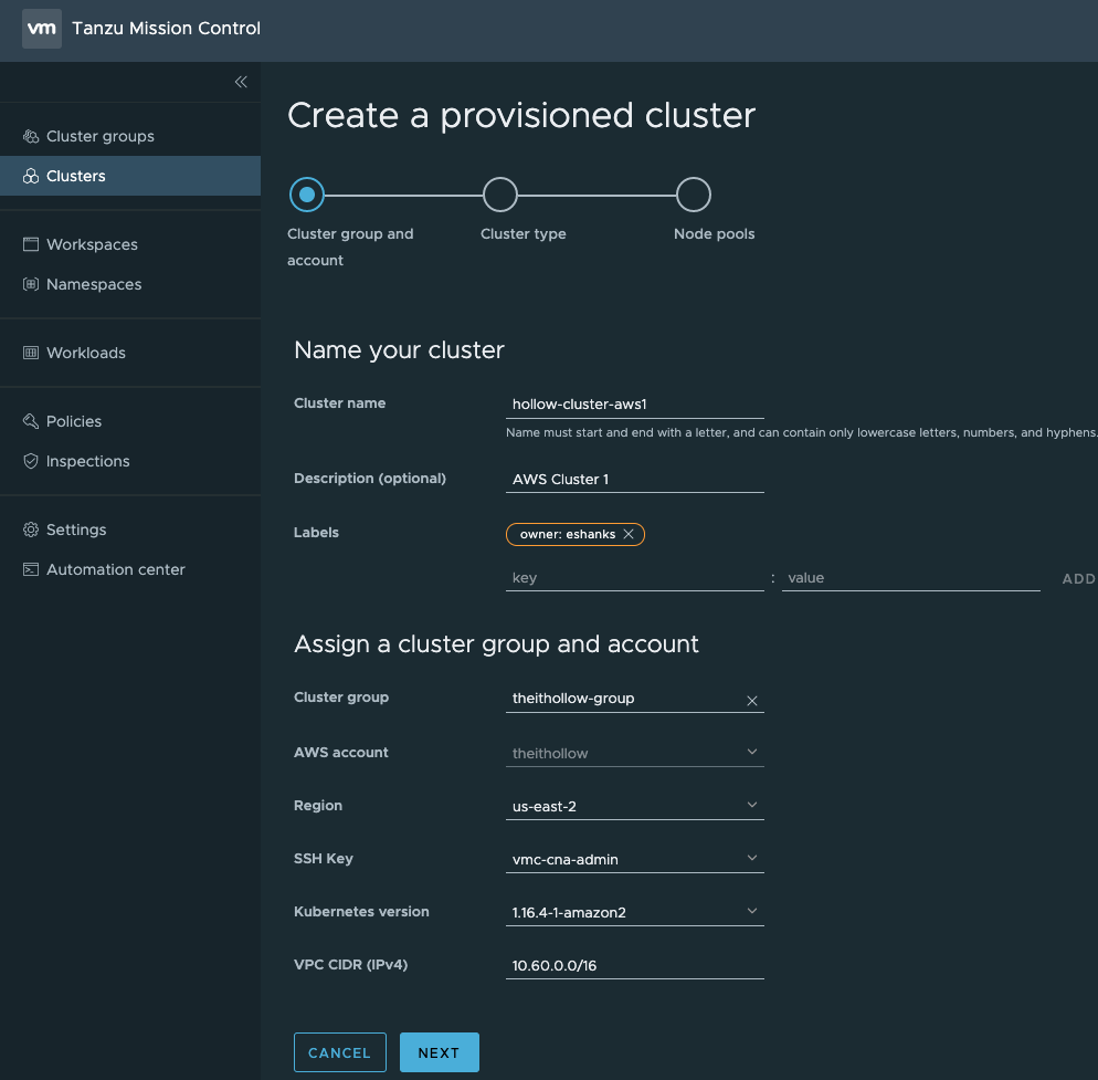 Here we’ll give the group a name and a description. We can also apply tags here which is a really useful feature for organizing your clusters between team members. I’ve added an owner tag with my username.