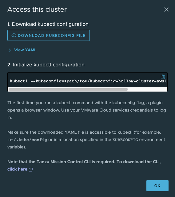 This screen will give you the details to download a KUBECONFIG file with your credentials, how to initialize the kubectl config and mentions that you’ll need to download the TMC CLI and place it within your system’s path.