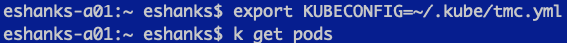 I’ve added my KUBECONFIG file and placed the TMC CLI in my path. After this I tried to run a simple get command as you can see here.