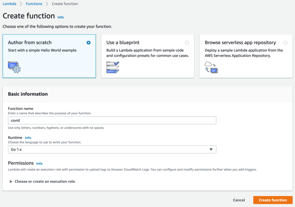 The code is ready to be used with Lambda. Login to your AWS account and go to the Lambda service. Create a new function. In the function setup be sure to give the function a name and select GO for the language.