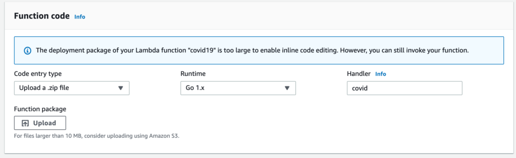 On the next screen be sure to upload the zip file created earlier and set the handler name to “covid”.