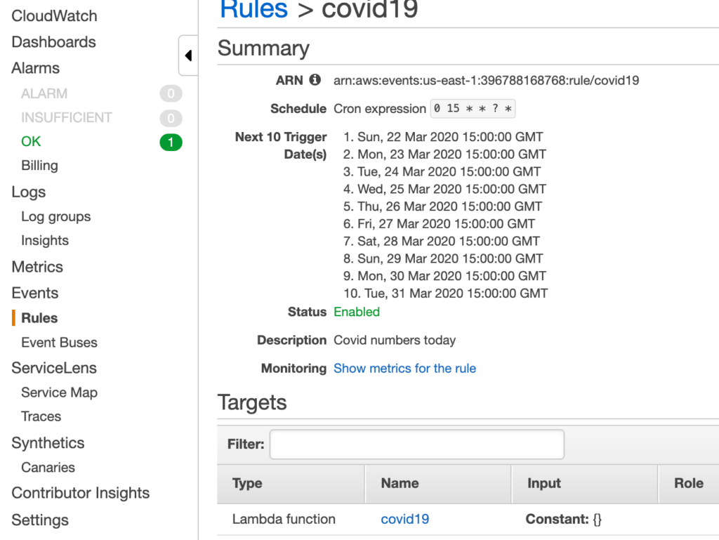 I setup a CloudWatch Event to run the lambda function on a schedule so I got a new message each day with the updated numbers.