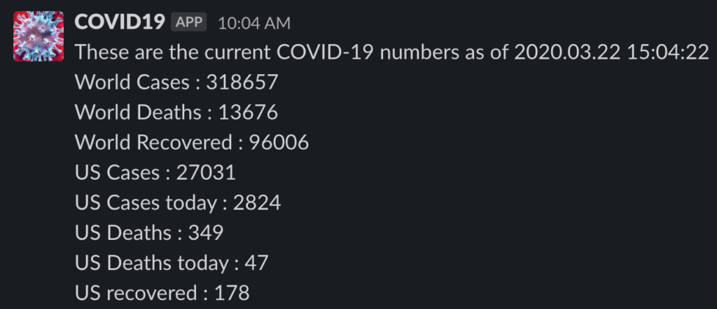 My team was asked to of course take care of our families, but also to take this opportunity to learn something new. I took this respite from normal activities to try to learn how to do some basic Golang (Go) programming. I have a hard time focusing on a project sometimes when there are no specific goals in mind, so my “Hello World” attempt at programming in Golang was to grab the latest COVID-19 statistics and post them to slack once per day.