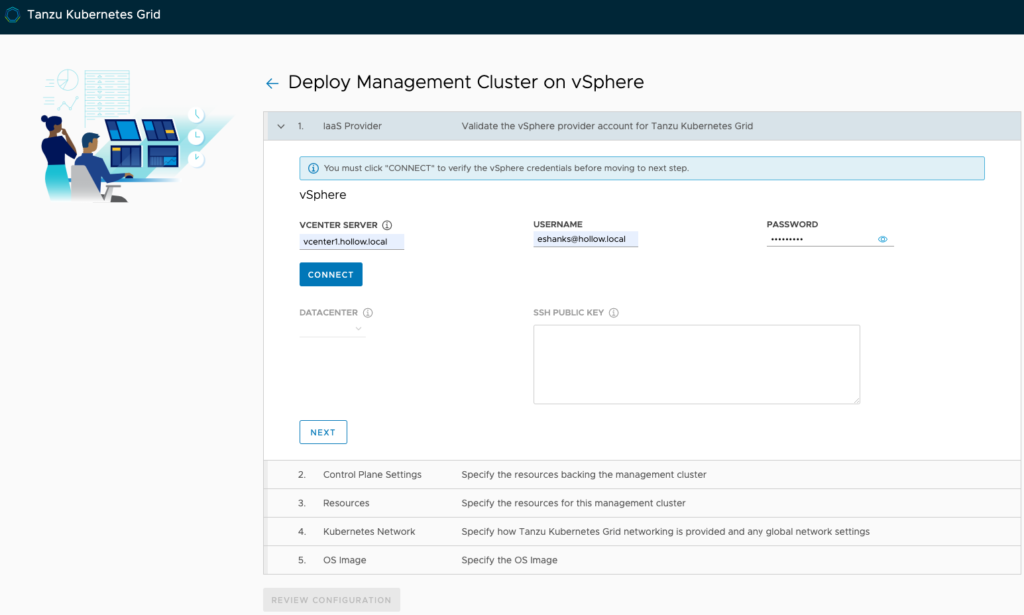 On the following screen, you’ll be asked for connection information for your vSphere environment. Fill out this information and click the “CONNECT” button. Once you do this, you should be able to select some vSphere objects through the rest of this wizard, if connection is successful.