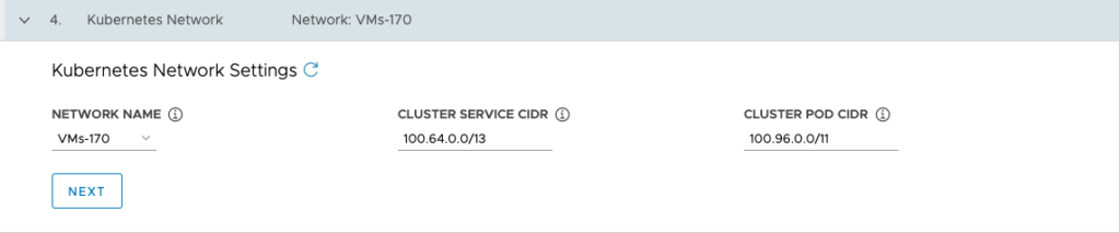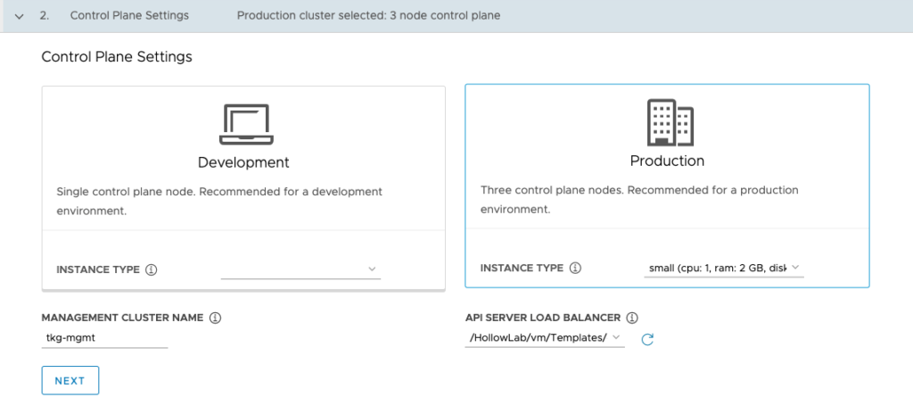 On the next screen you’ll be faced with a choice for the size and availability of your cluster. Select Development if you’d prefer a smaller cluster with a single control plane node. (READ not for production use) You can also select a Production option if you want a three node control plane for your cluster. After picking the deployment type, select the instance type which is the size of the VMs. Below this, you can optionally set the cluster name, and then you should select the Load Balancer template which was one of the OVAs that was imported during the pre-requisites section.