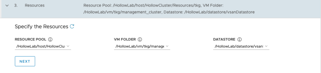 On the resources screen, select the Resource Pool, VM Folder and Datastore where your virtual machines will live.
