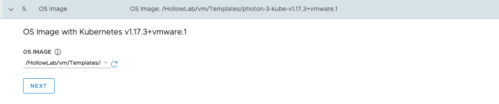 On the last screen select the OS image used for the virtual machines. This is the other OVA that was imported into the vCenter during the prerequisites section.